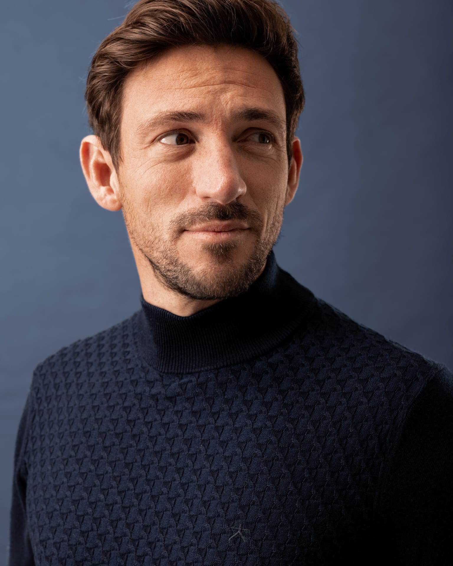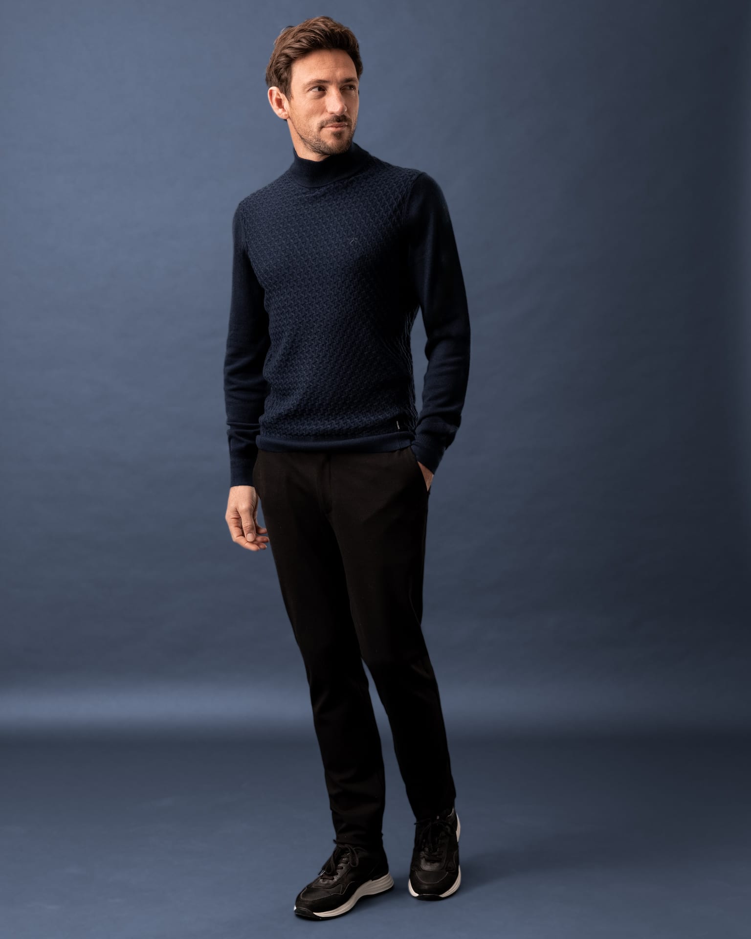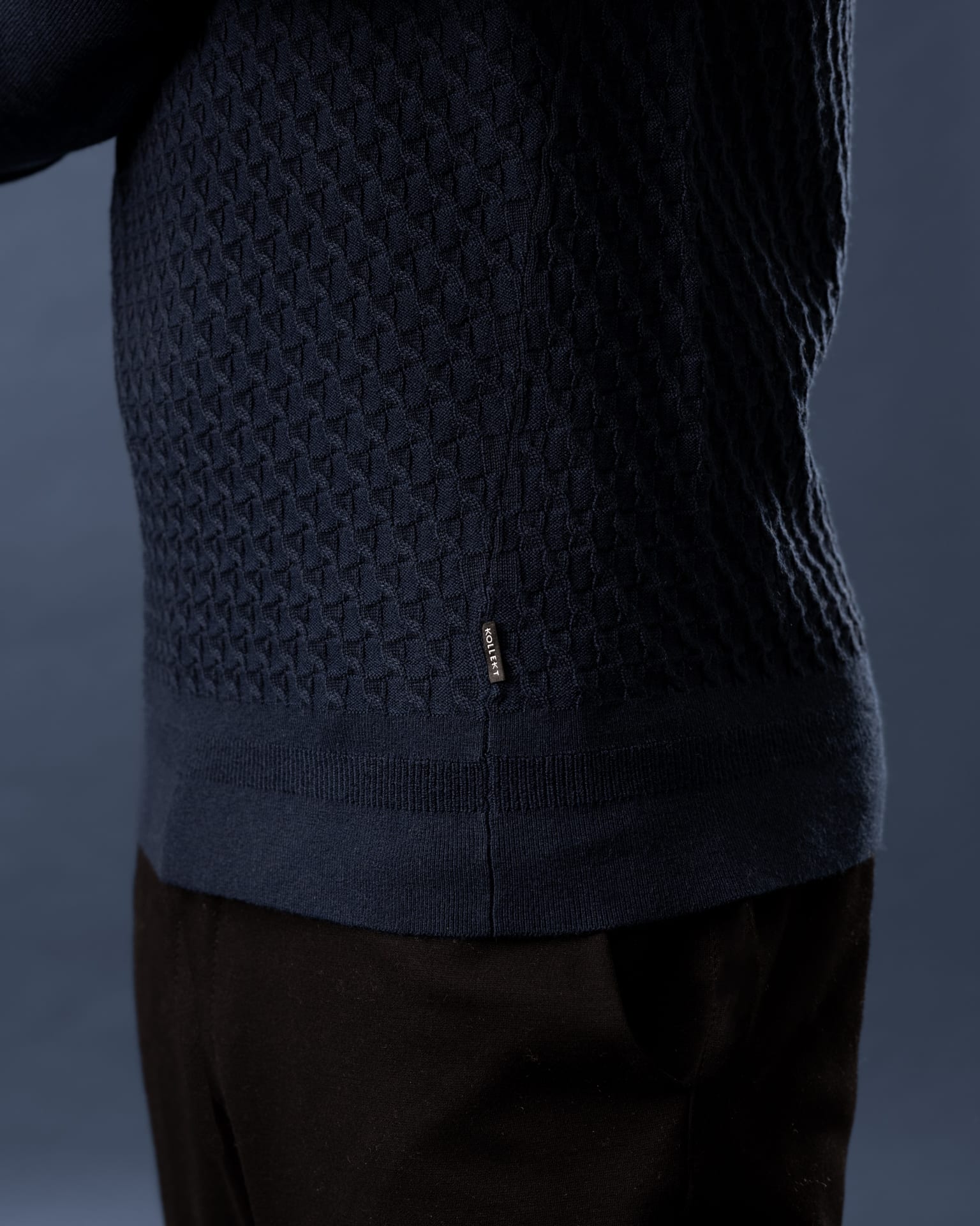De combinatie van merino en lyocell zorgt voor een zijdezachte feel, optimale ademend vermogen en natuurlijke warmte, terwijl het behoud van vorm en frisheid gegarandeerd blijft, ongeacht hoe vaak je het draagt of wast. Geen pilling, geen krimp—alleen perfecte prestaties. De subtiele twist-check-structuur geeft de trui een onderscheidend karakter, perfect voor elke gelegenheid.